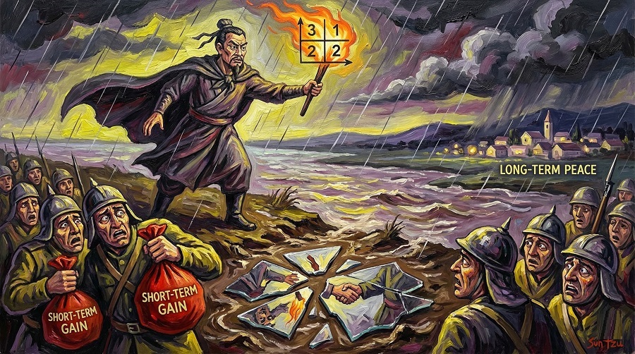 A zero-sum game is pure duel. Your gain equals my loss. The total payoff is fixed like a sack of grain: if you take more, I eat less. Many battlefield contests approximate this: taking a hill, capturing a convoy, winning a single skirmish where only control matters.
